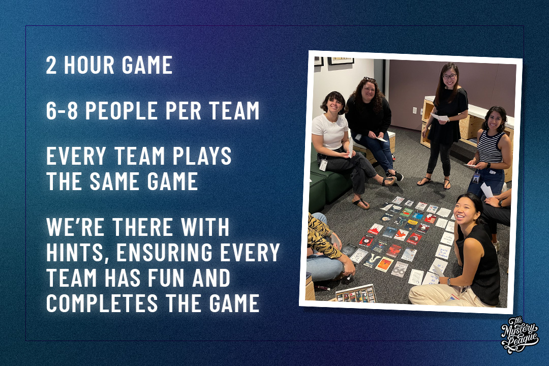 Email hello@mysteryleague.com with any useful info about your event — or use this form — and we'll get back to you within a couple of days.